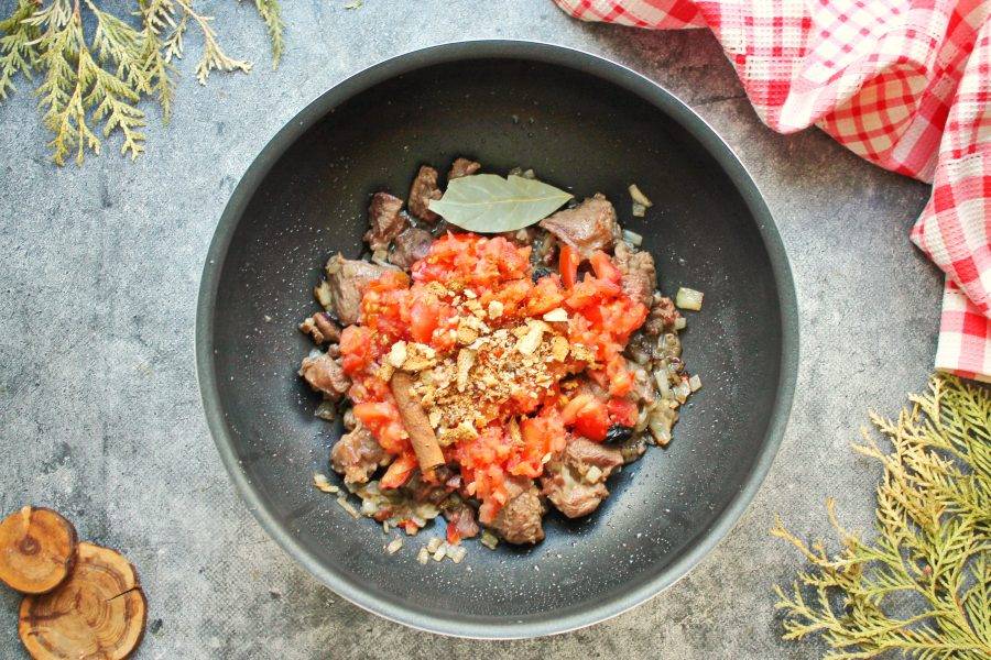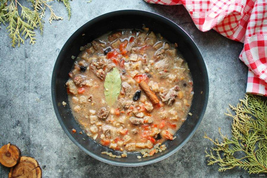 Добавьте в казан помидоры в собственном соку, лавровый лист и тертый пряник.