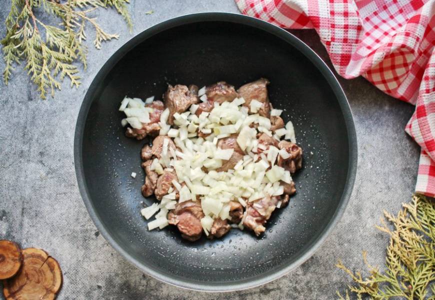 Репчатый лук мелко порежьте и выложите в казан. Обжаривайте все еще 4 минуты, перемешивая.
