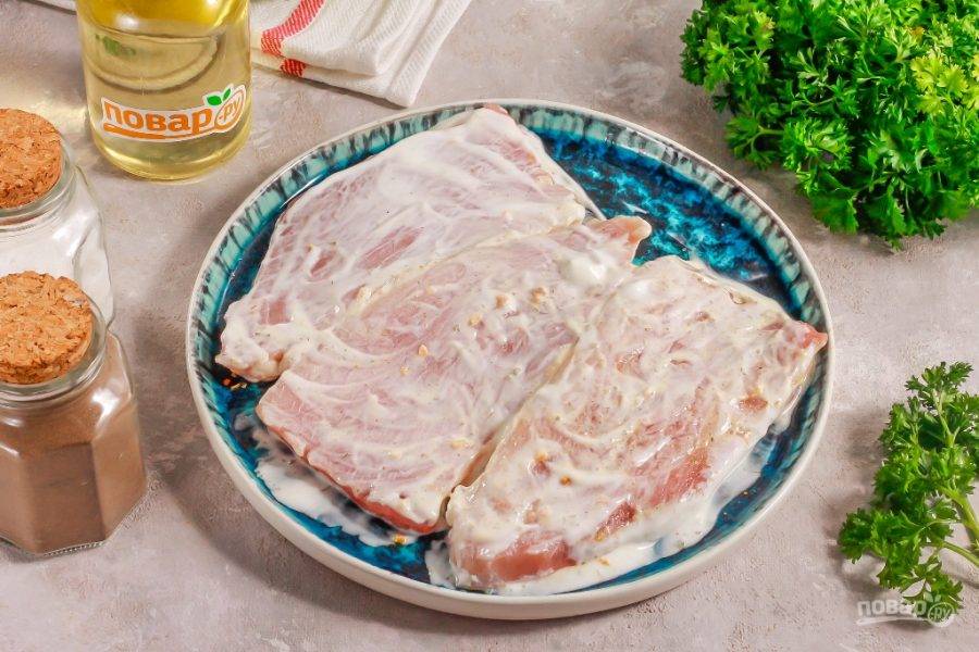 Обмажьте мясо сметаной с обеих сторон и оставьте мариноваться примерно на 30 минут.