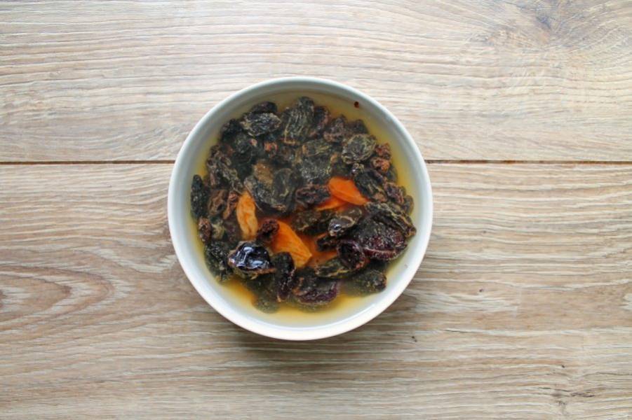 Выложите в миску курагу, чернослив и изюм. Залейте сухофрукты кипятком и оставьте на 15 минут. Слейте воду и промойте их теплой водой, дайте ей стечь.