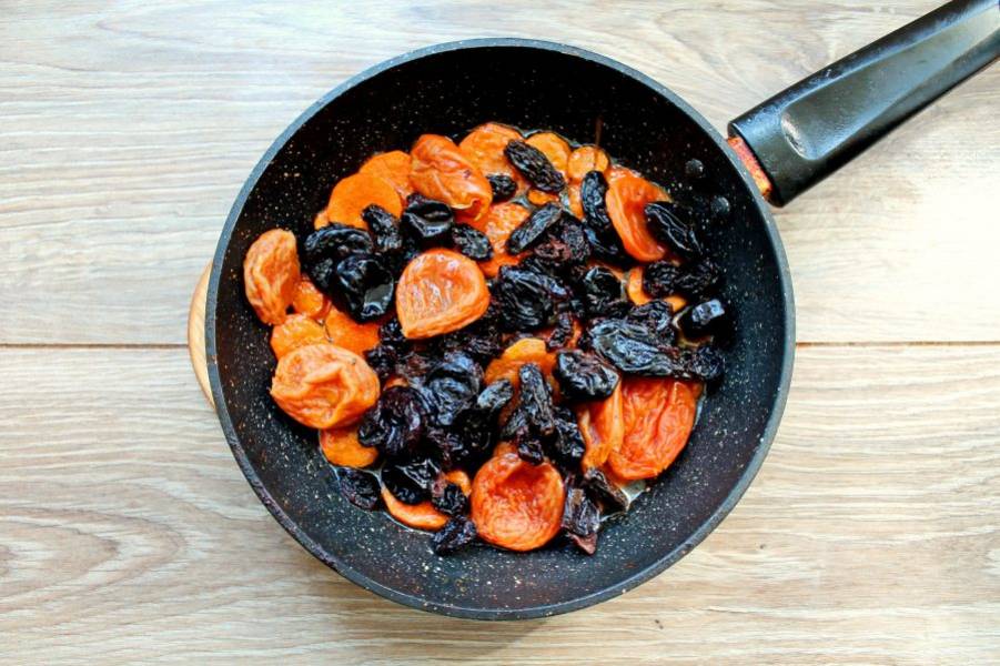 Добавьте в сковороду сухофрукты, влейте воду и тушите все до мягкости моркови.