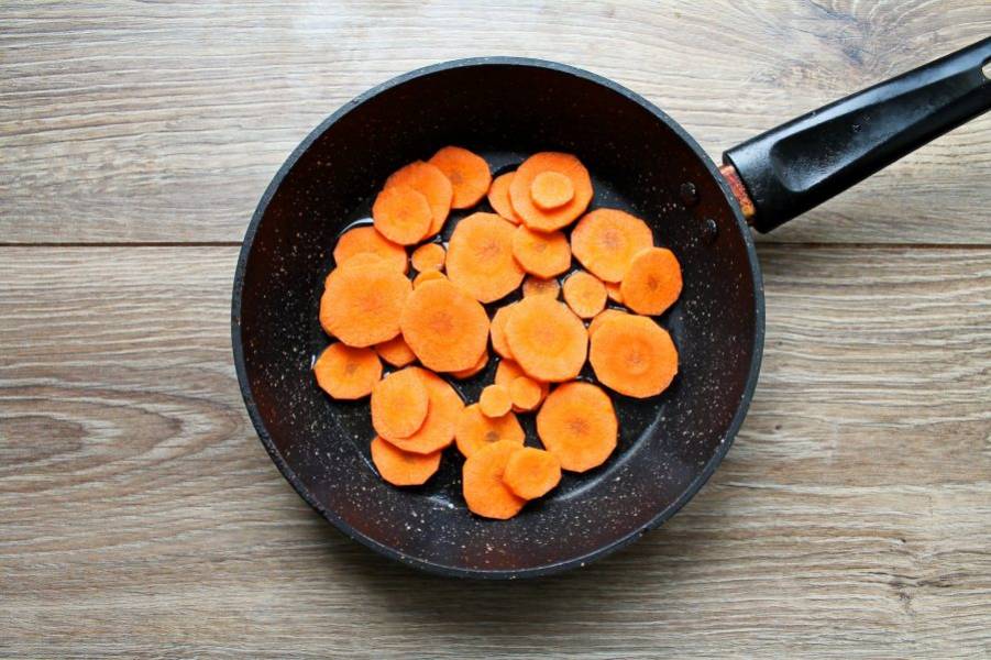Морковь почистите и порежьте кружочками. В сковороду налейте масло, разогрейте на среднем огне, выложите морковь.