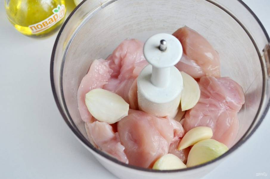 3. Куриное филе вымойте, порежьте крупно, сложите в чашу измельчителя. Туда же добавьте лук, чеснок. Включите машинку на пару минут.