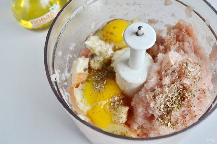 4. В куриный фарш добавьте сырые яйца, специи, соль, хлеб с молоком, сливки. Можно добавить зелень. Включите машинку еще на минуту.