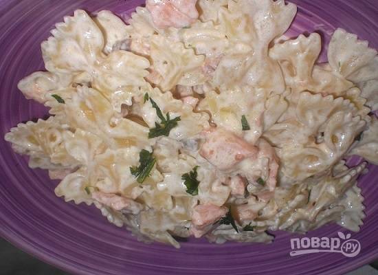 Добавляем к рыбе фарфалле, заливаем сливками. Перемешиваем и прогреваем минутку-полторы.