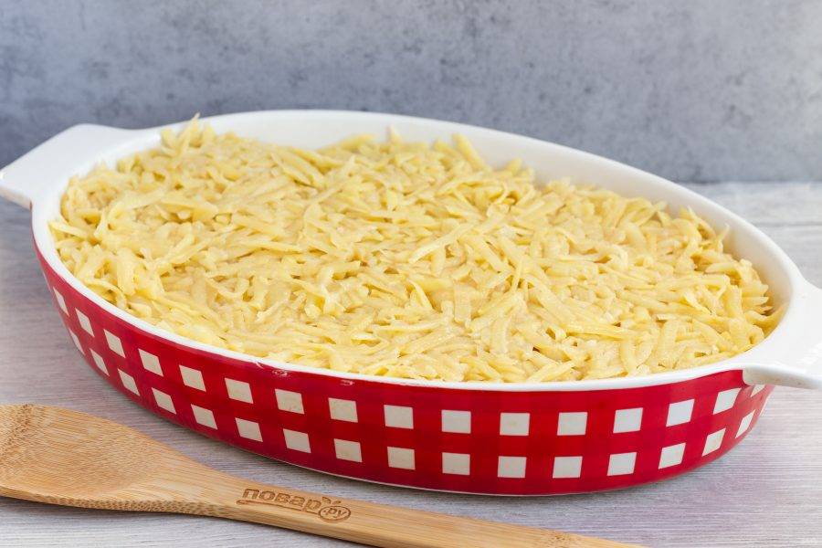 Сыр натрите на крупной терке. По истечении времени достаньте запеканку, посыпьте сыром и поставьте ещё на 10 минут в духовку. Если есть режим "гриль", то в конце три минуты можно запечь сыр под грилем при температуре 220 градусов.