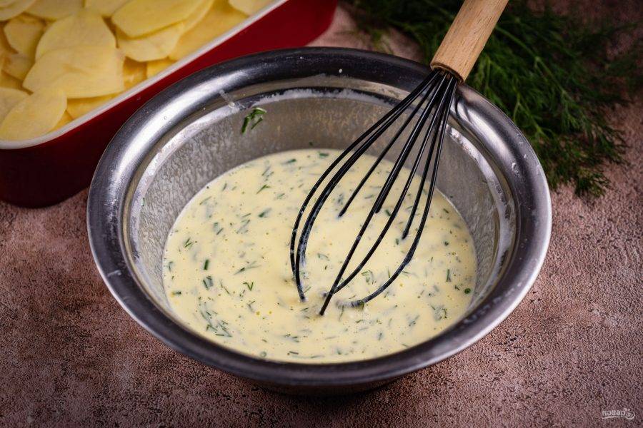 Этой смесью залейте картофель с фаршем в форме.