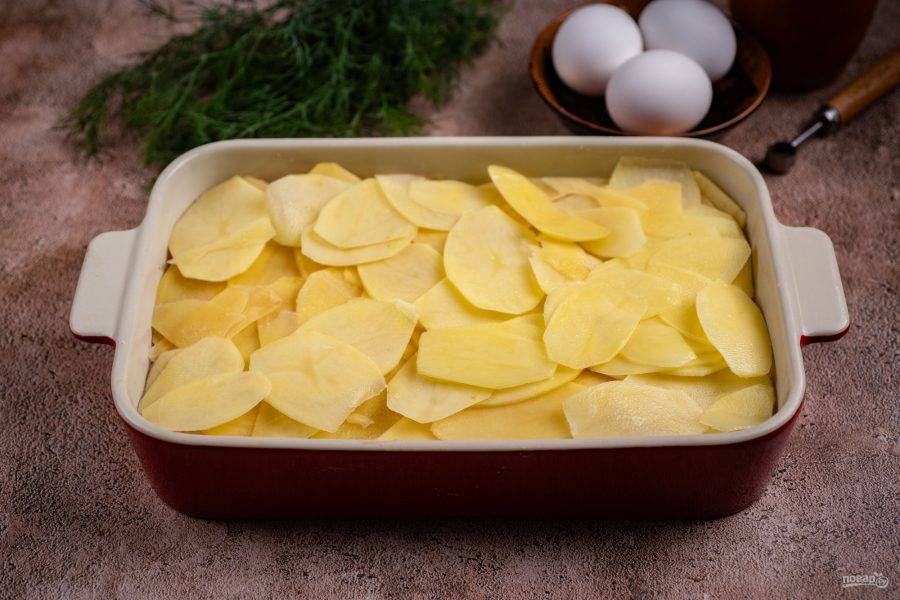 Дно формы для запекания смажьте растительным маслом и выложите половину картофельных ломтиков слоем, присолите немного (1/2 ч.л. соли).