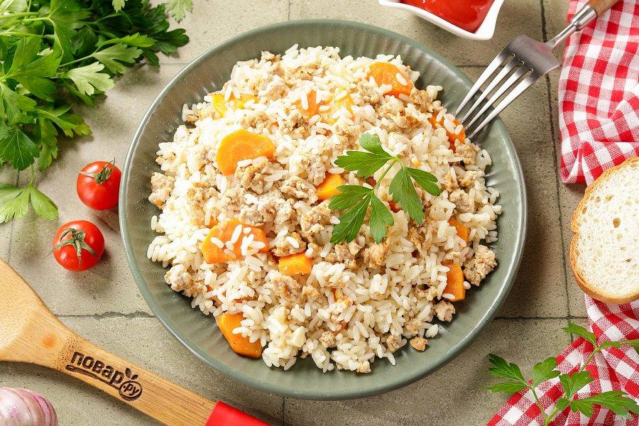 Фарш с рисом в духовке готов. Разложите по тарелкам и подайте к столу.
