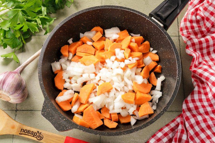 В сковороде разогрейте растительное масло. Выложите нарезанные произвольно лук и морковь.
