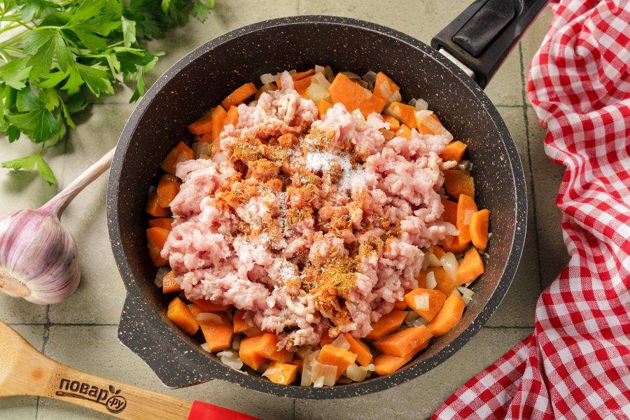Добавьте фарш, соль и специи по вкусу.