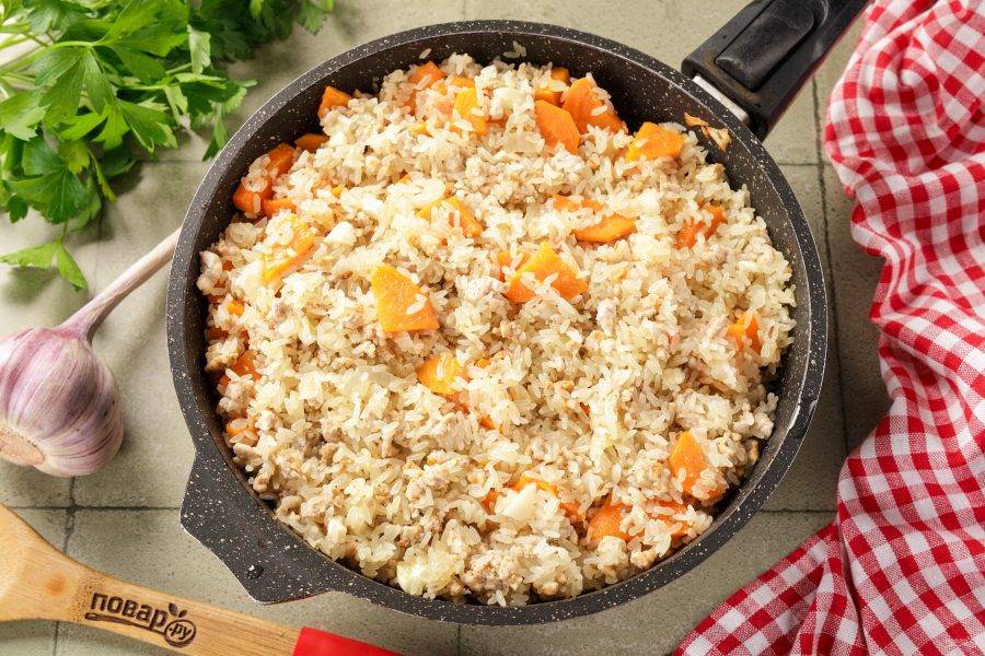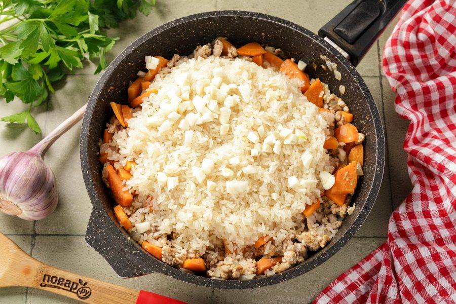 Добавьте промытый рис и нарезанный кубиками чеснок.