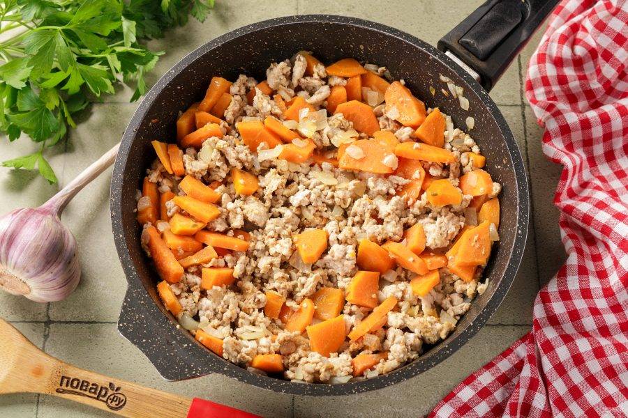Обжарьте фарш с овощами в течение 5 минут, разбивая комочки лопаткой.