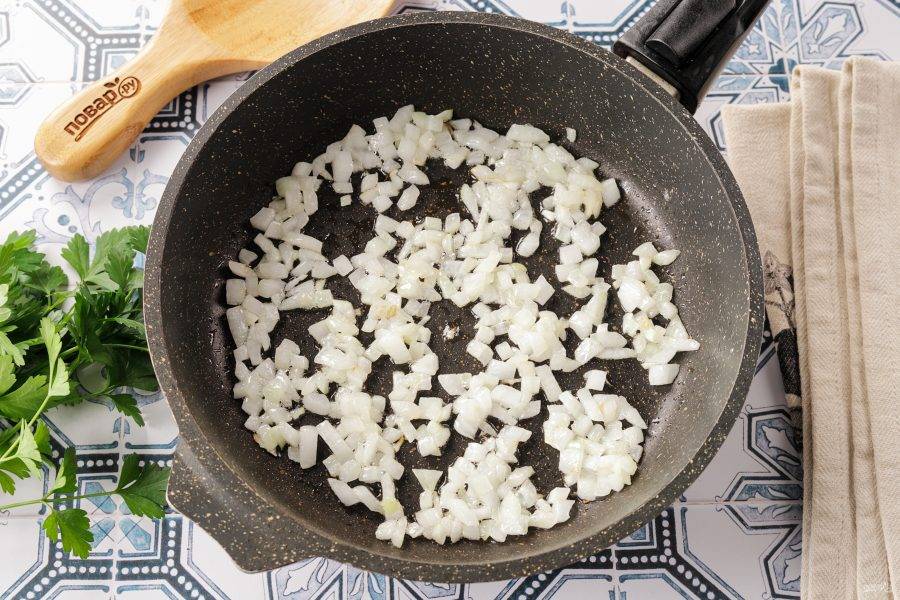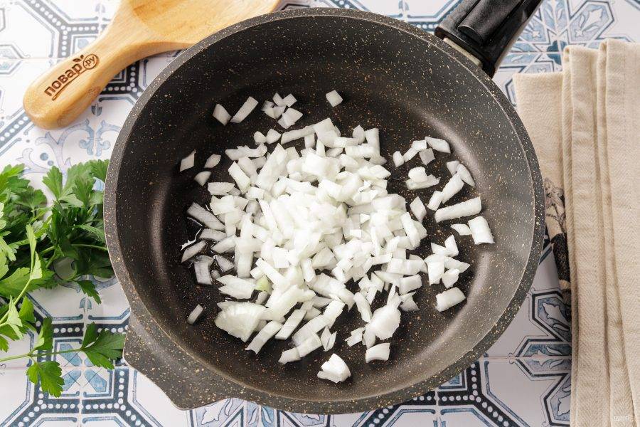 Лук нарежьте кубиками и выложите на разогретую сковороду с маслом.