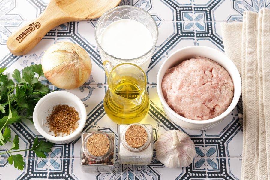 Подготовьте все ингредиенты по списку. Фарш можете взять любой. Специи используйте те, какие больше любите.