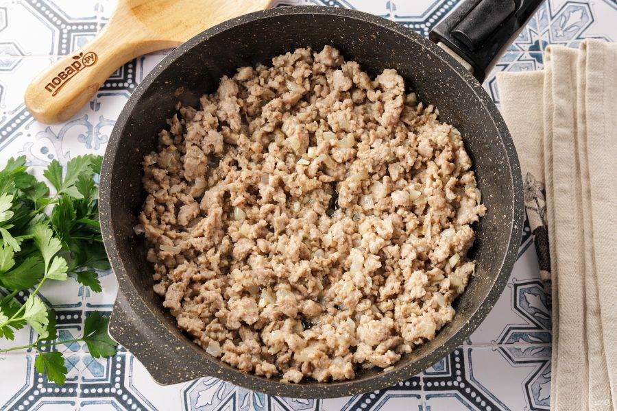 Жарьте, разбивая комочки фарша лопаткой. Время готовности около 7-10 минут.