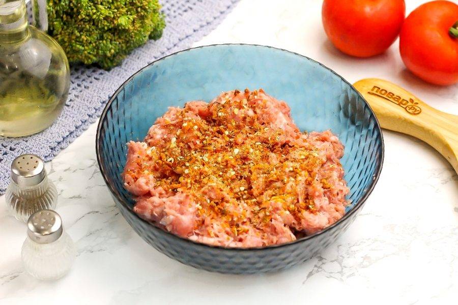 Выложите фарш в глубокую миску или салатник, но без серебристых или золотистых линий, не пластмассовый и не алюминиевый! Присыпьте приготовленной приправой. Можно использовать молотый сушеный чеснок, измельченные вяленые томаты с базиликом, орегано и т.д. Тщательно вымешайте все содержимое емкости.