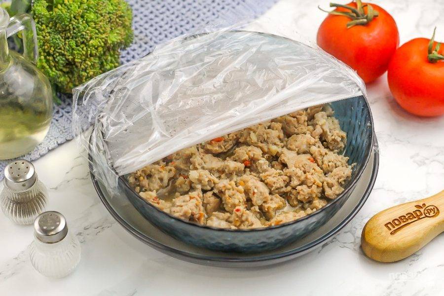 Активируйте нагрев на 10 минут, но через 5 минут аккуратно приоткройте дверцу техники, приподнимите пленку, стараясь не обжечься. Перемешайте фарш для равномерного приготовления и далее доготовьте его, не забыв закрыть пищевой пленкой. Фарш выделит бульон, собьется в крупные комочки — удалите пленку и аккуратно измельчите комочки вилкой, слив жидкость.