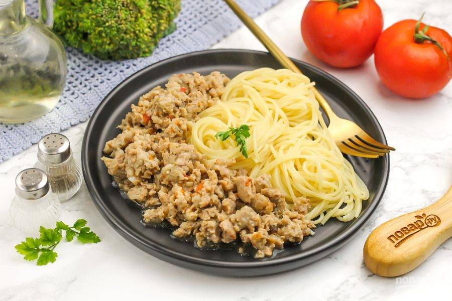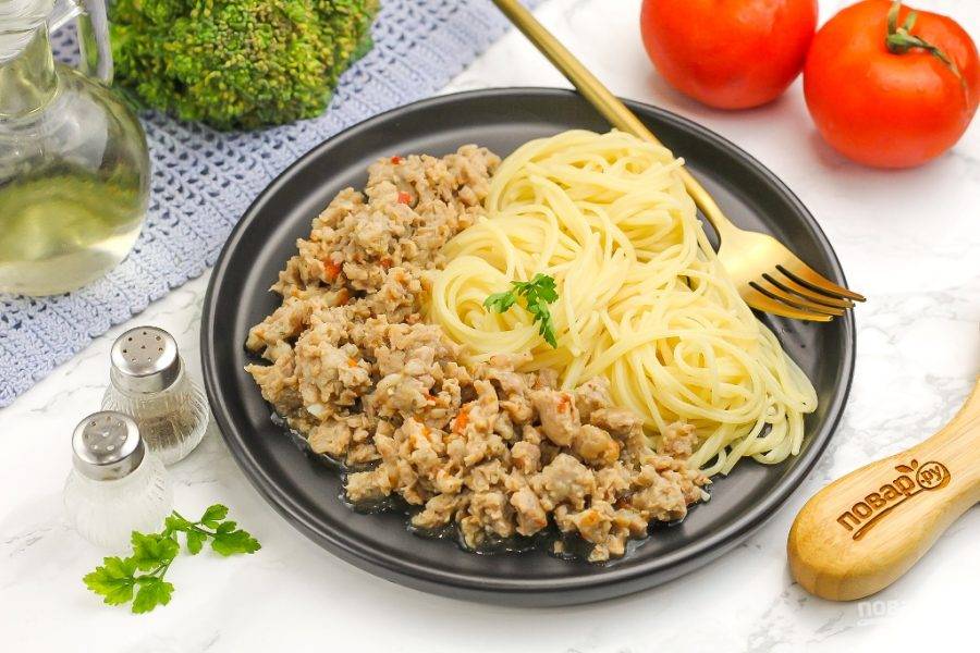 Отварите спагетти, гречневую крупу, рис или подайте любой другой гарнир из свежих или квашеных овощей. Добавьте на тарелку приготовленный фарш и насладитесь отменным завтраком, обедом или ужином! Не забудьте про соусы.
