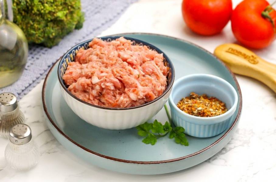 Подготовьте указанные продукты. Фарш приобретите готовый или приготовьте его сами, прокручивая свинину через мясорубку. Если приобретали замороженный продукт, то обязательно разморозьте его за 1 час и слейте выделившуюся жидкость. При добавлении лука или чеснока, очистите их и промойте.