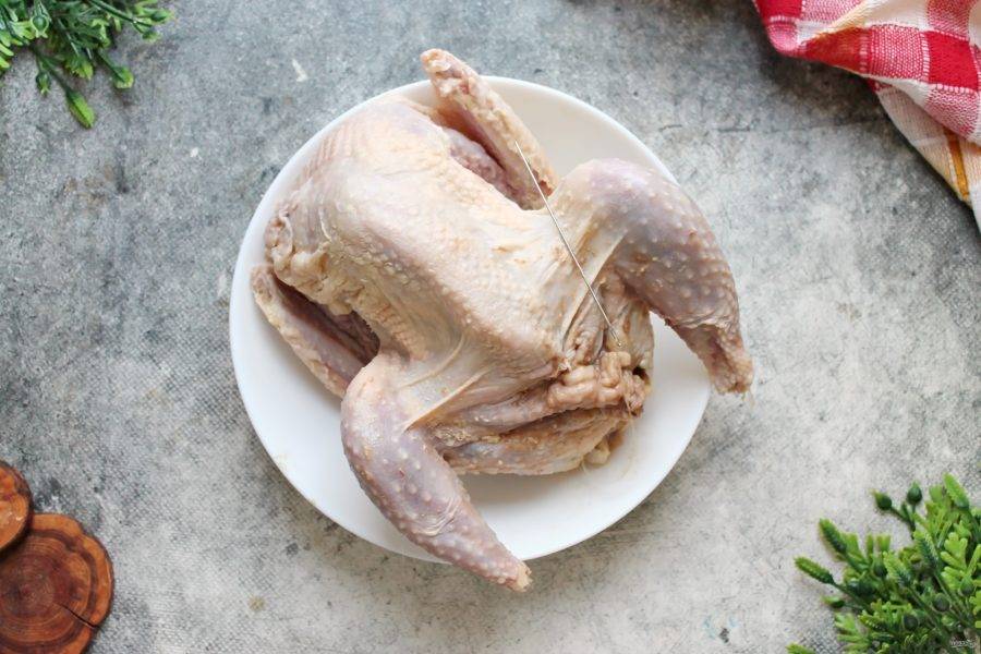 Всю курицу смажьте растительным маслом и натрите специями. У меня прованские травы, но можно взять на свой вкус. Чтобы крылья не торчали, их можно прижать при помощи кулинарной нити или специального шнура.