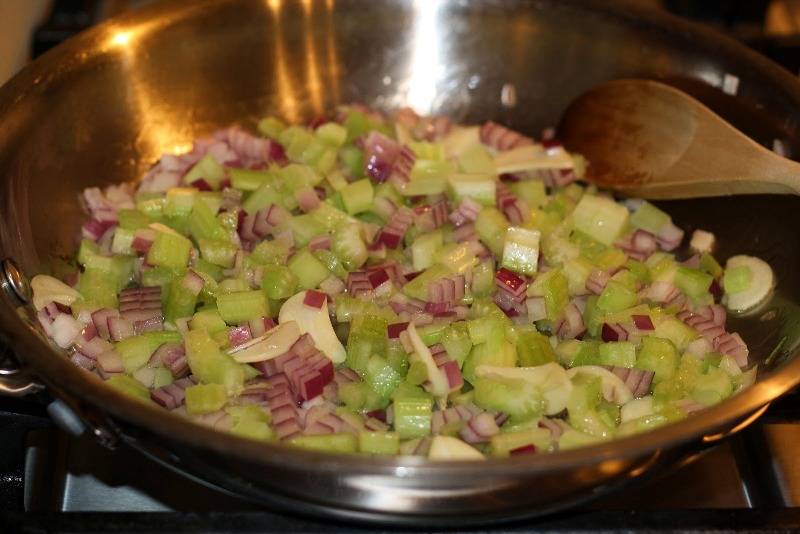 Далее разогреваем на сковороде оливковое масло и обжариваем на нем до мягкости лук, чеснок и сельдерей.
