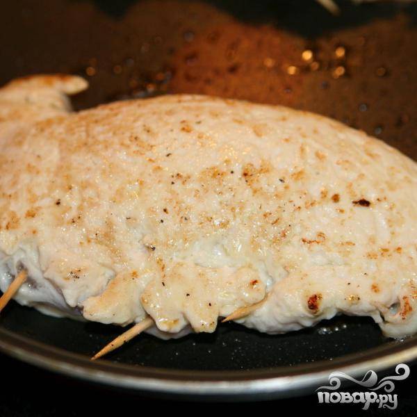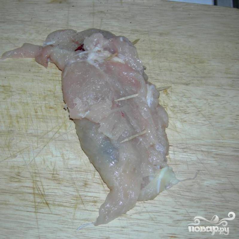 Завернуть филе начинкой внутрь и зафиксировать зубочистками.