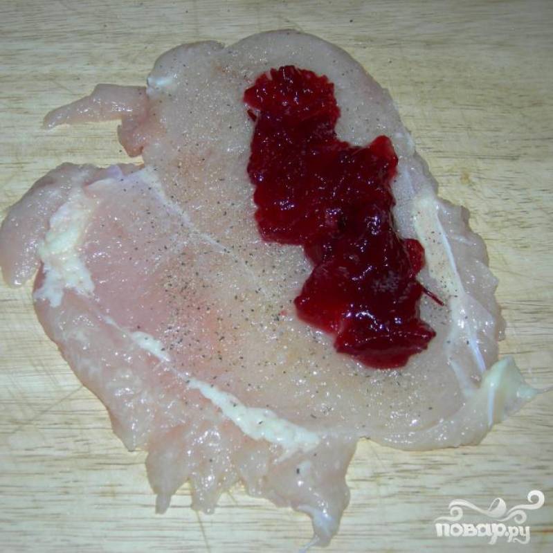Отбить куриное филе молоточком. Посыпать солью и перцем. Разделить клюквенный соус на 2 части. Выложить соус (примерно 3 ст. ложки) на половину отбивной.