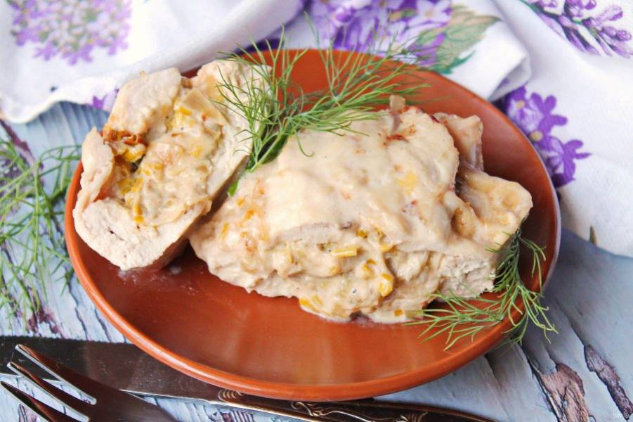 Фаршированная куриная грудка "Кармашки" сможет украсить любой праздничный стол и удивить гостей. Ведь внутри нежной курочки спрятана нежная овощная начинка со сливками.