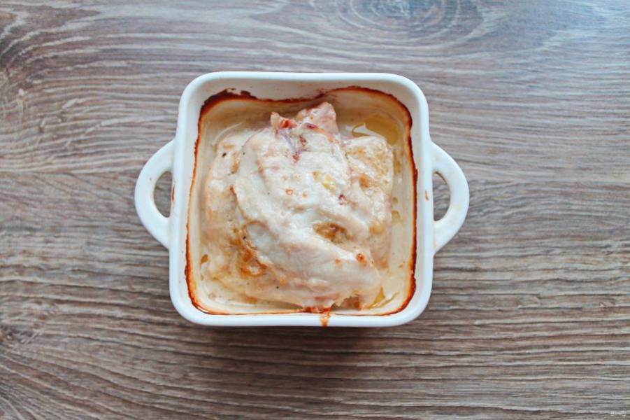 Достаньте филе с фаршированной грудкой из духовки, полейте оставшимися сливками и поставьте запекаться еще на 10 минут. Извлеките из духовки, дайте постоять 5 минут и подавайте к столу.