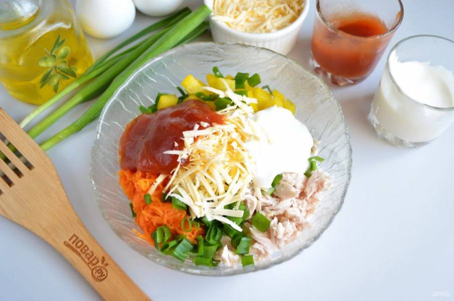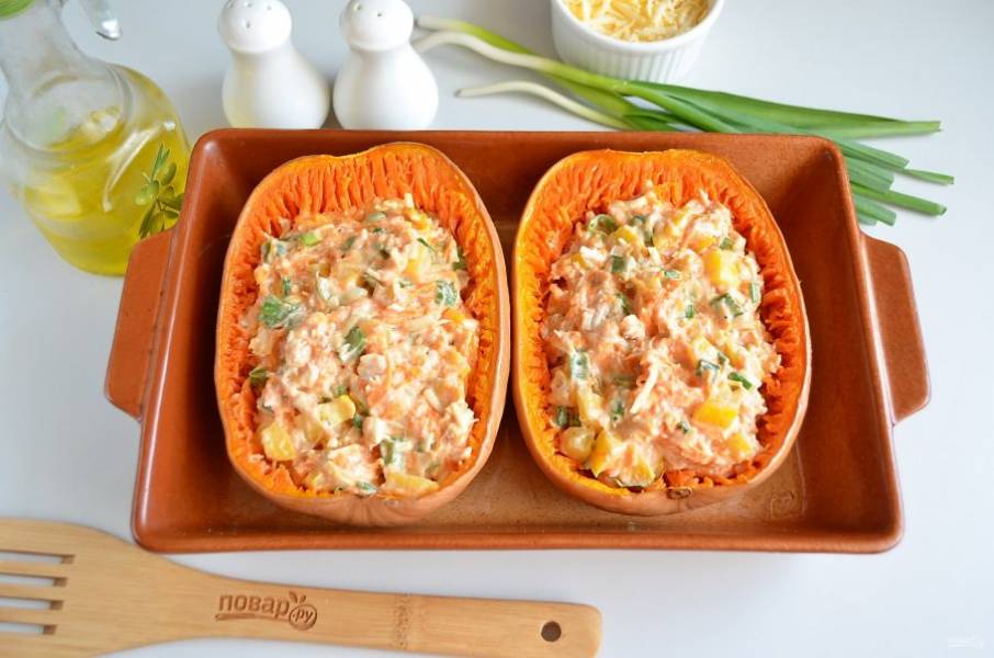 Для начинки соедините куриное филе (волокна), тыкву, сметану, соус, соль, перец черный молотый, перец сладкий (порезанный кубиками), 150 г сыра, зеленый лук. Перемешайте.