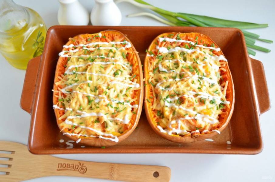 Фаршированная тыква-спагетти готова! Полейте сверху сметаной, посыпьте зеленью. Подавайте горячей. Приятного!
