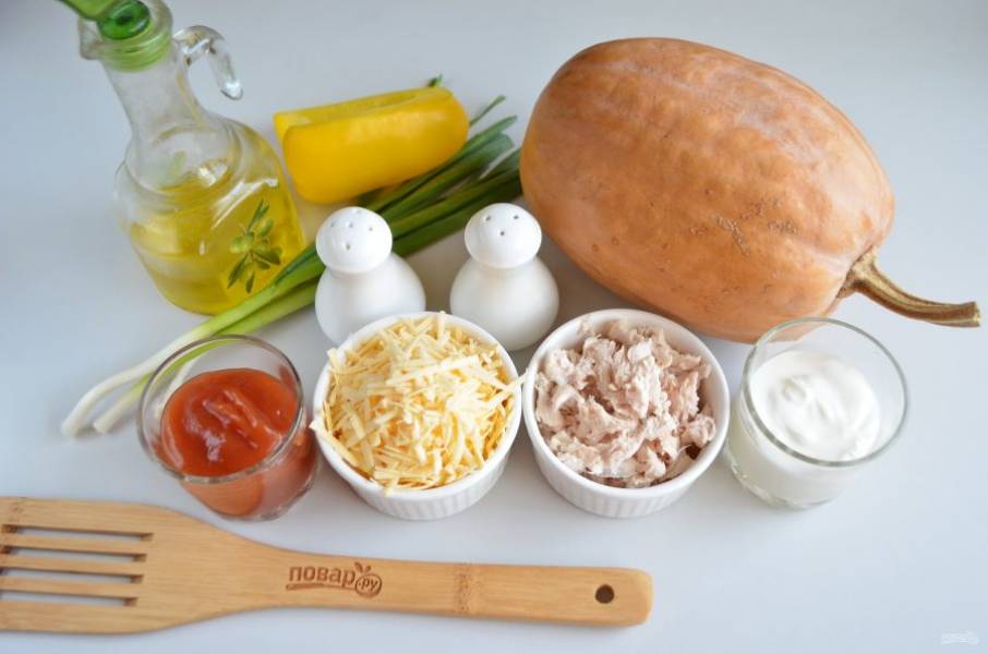 Интересный и вкусный рецепт для любителей тыквы. Кроме курицы там сладкий перец, много сыра и соусов, зелень. Смотрите, как приготовить фаршированную тыкву-спагетти курицей! Очень оригинально!