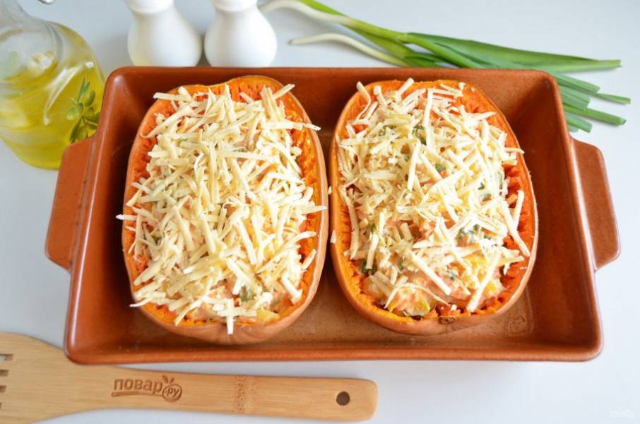 Сверху распределите оставшиеся 50 г сыра. Отправьте тыкву в духовку на 20 минут, температура — 200-220 градусов.