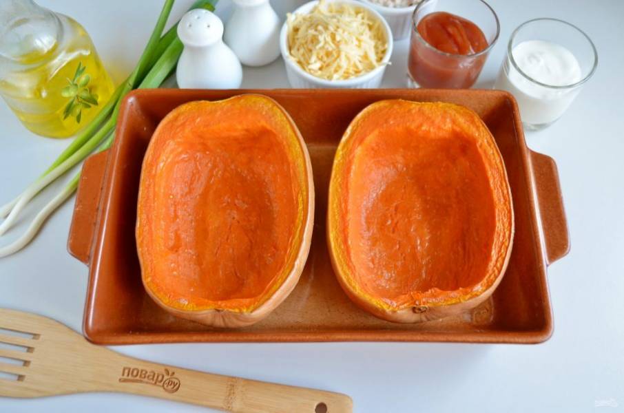 Разрежьте тыкву на две равные половинки. Удалите внутренности, ложкой поскребите, чтобы удалить волокнистый край. Смажьте сердцевину и бока тыквы оливковым маслом. Отправьте в духовку на 30-35 минут запекаться до готовности, температура — 200 градусов.