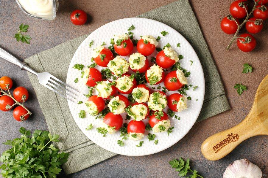 Фаршированные черри готовы. Украсьте закуску зеленью и подавайте к столу. Приятного аппетита!