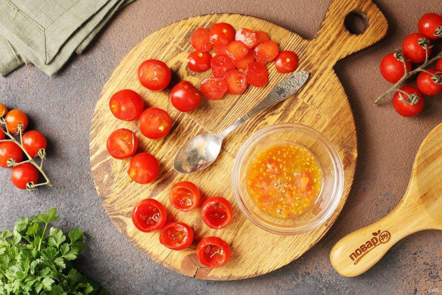 Помидорки промойте и срежьте верхушку. При помощи чайной ложки извлеките мякоть.