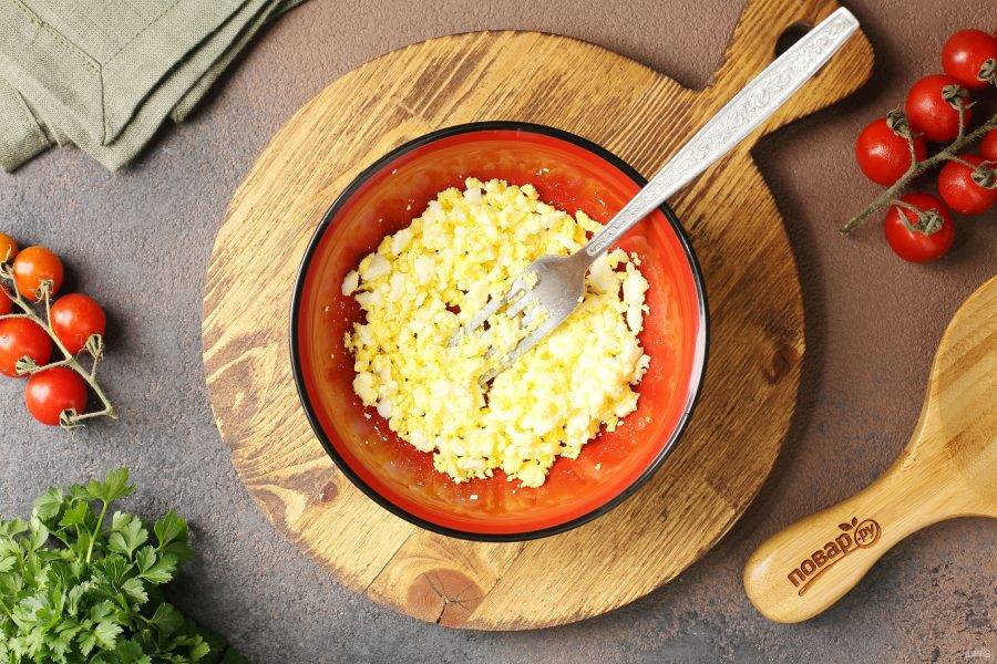 Яйцо очистите и разомните вилкой.