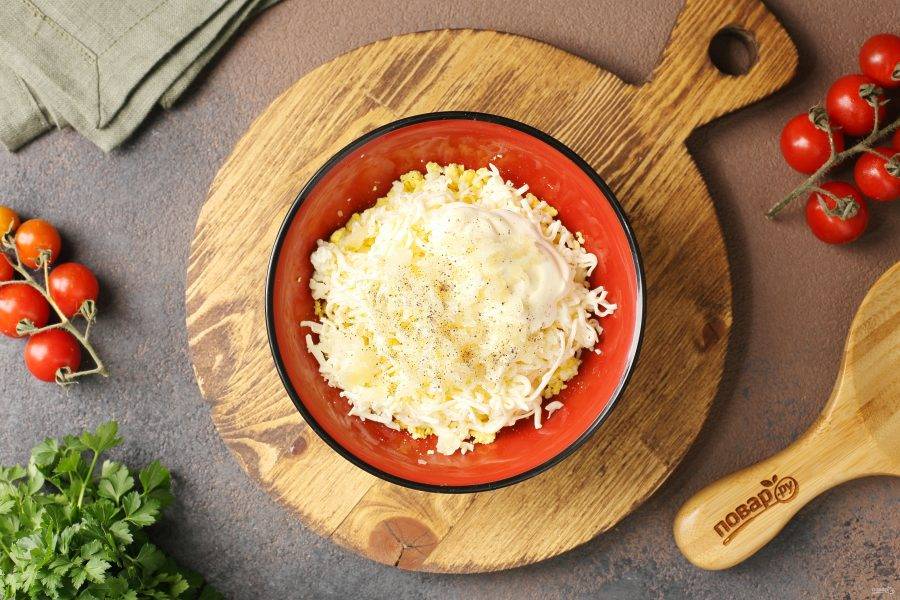 Добавьте тёртый на мелкой тёрке сыр. Чтобы сырок лучше тёрся, его можно предварительно положить на 30 минут в морозилку. Выдавите через пресс чеснок, добавьте по вкусу майонез, соль и перец по вкусу.