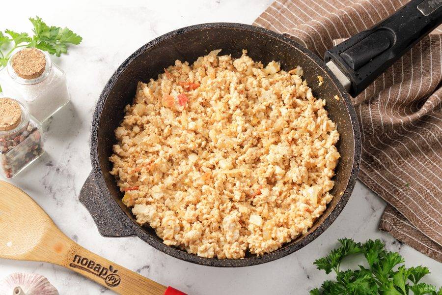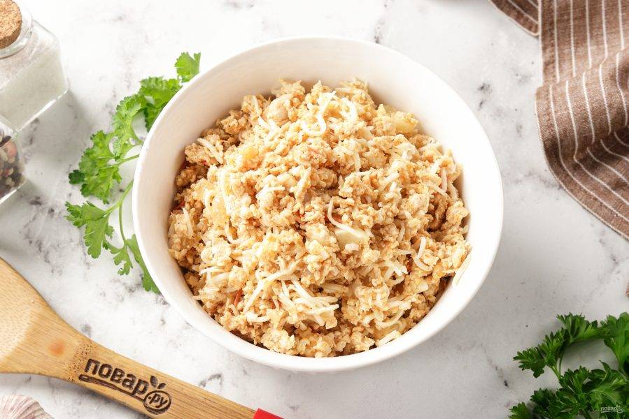 К остывшему фаршу добавьте тёртый сыр и перемешайте. Начинка готова.