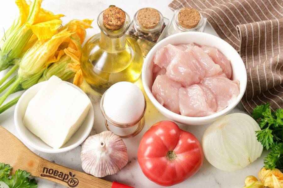 Подготовьте все ингредиенты. Грудку промойте, обсушите и нарежьте кусочками.