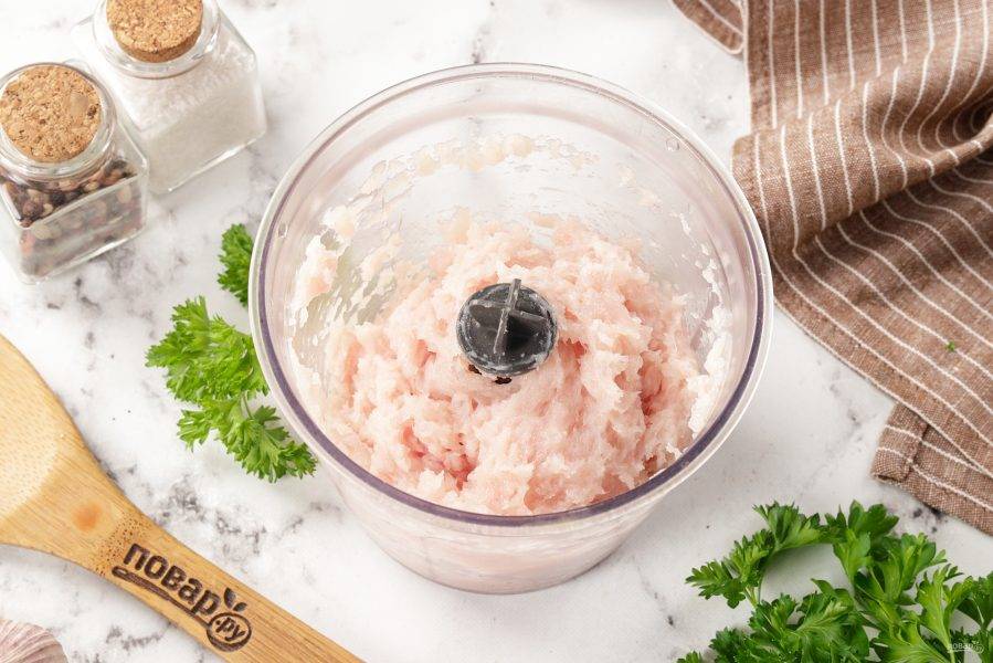 Измельчите куриное филе при помощи мясорубки или блендера.