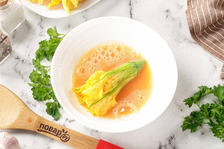 Взбейте яйцо с солью и перцем. Обмакните каждый цветок в яйцо.