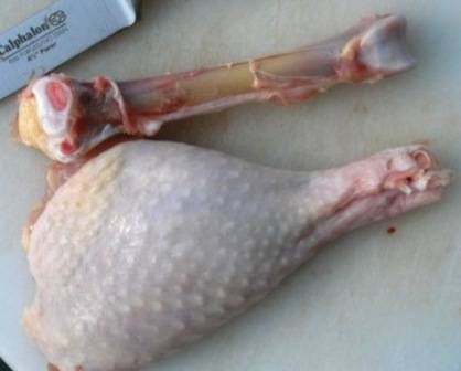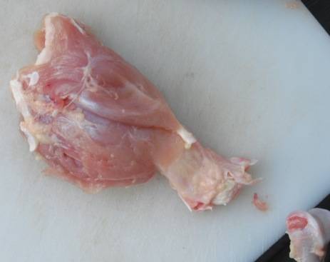 Помогая себе пальцами, отделяем мясо от кости и опускаем его вниз (как носок).