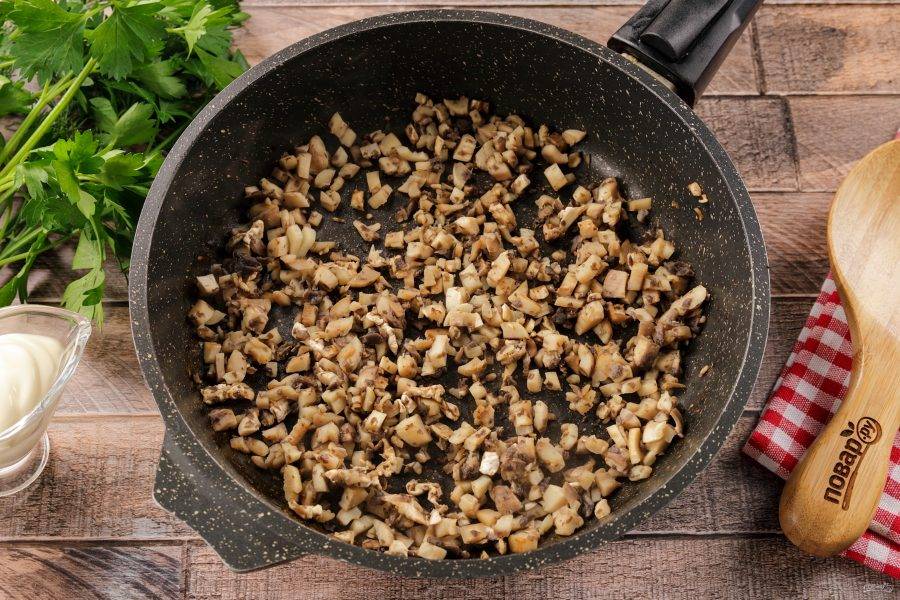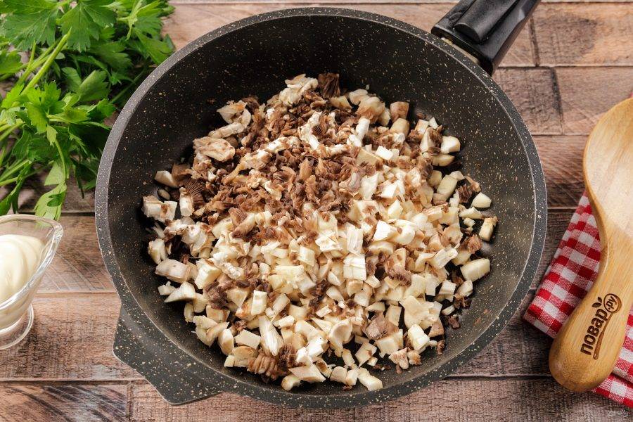Нарежьте ножки грибов мелкими кубиками. Выложите на разогретую сухую сковороду.