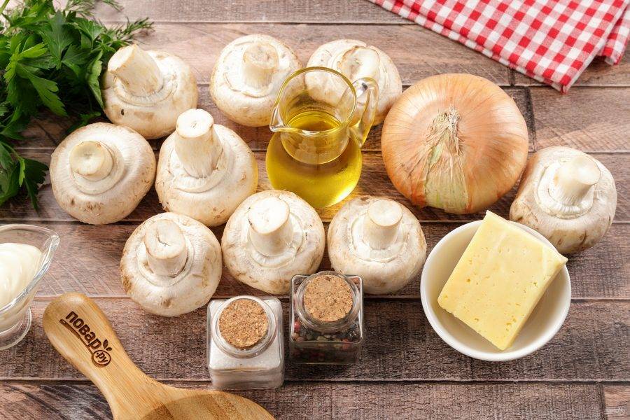 Подготовьте все ингредиенты по списку. Грибы выберите плотные и примерно одного размера, если лук небольшой, возьмите пару штук.