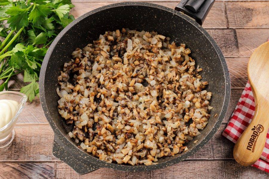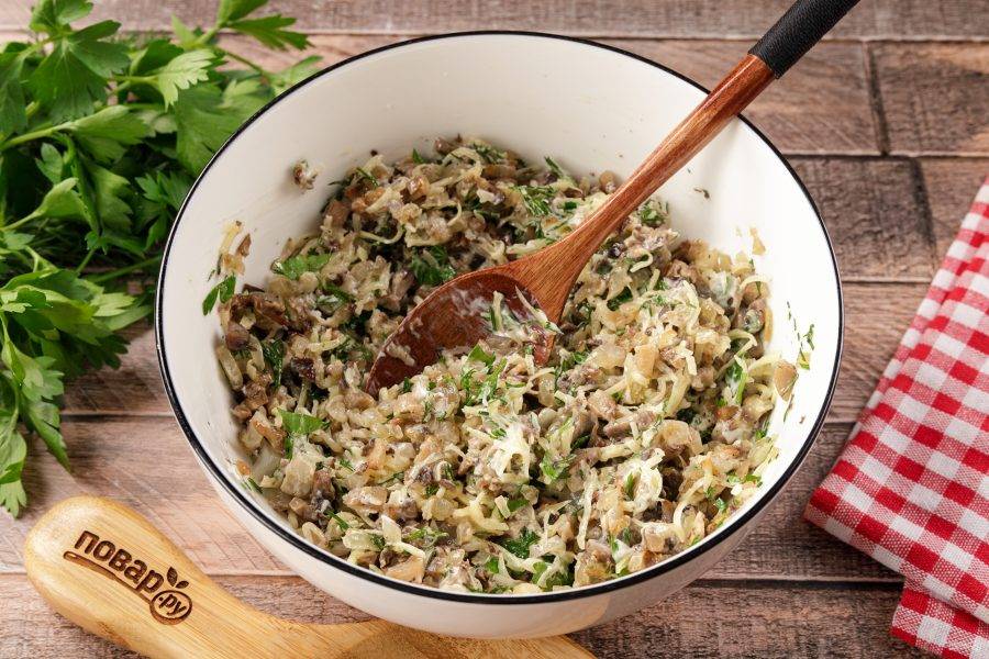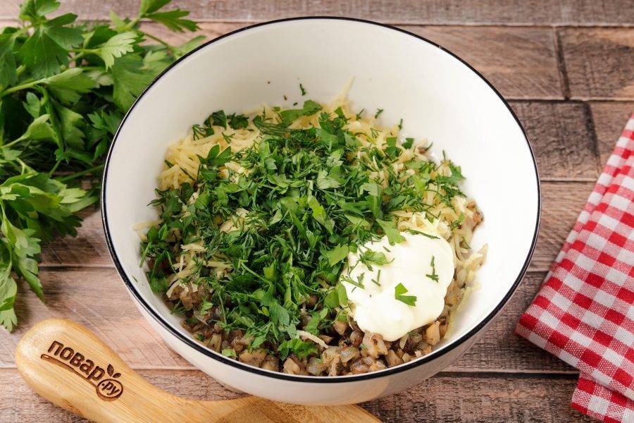 Переложите начинку в глубокую миску. Дайте остыть. Добавьте тёртый на мелкой тёрке сыр (немного оставьте для верха), майонез добавьте по вкусу. Дополнительно можно добавить свежую зелень, у меня петрушка и укроп.