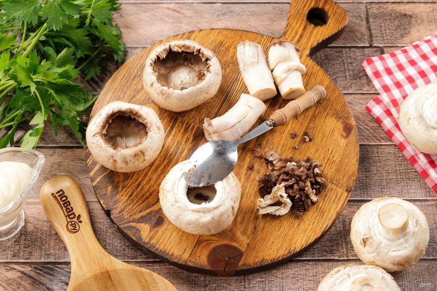Шампиньоны очистите от загрязнений. Удалите ножки. Не повреждая шляпку, дополнительно можно поскребсти чайной ложкой изнутри.