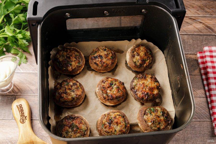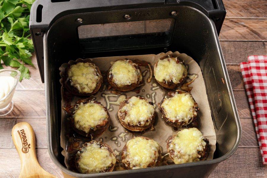 Подготовленной начинкой наполните шляпки шампиньонов. Выложите в чашу аэрогриля.