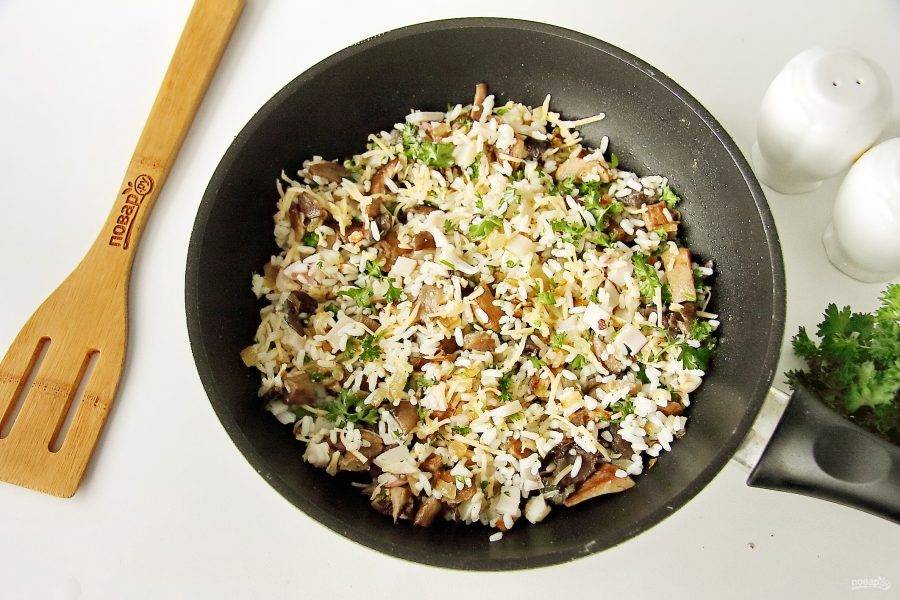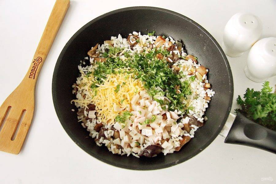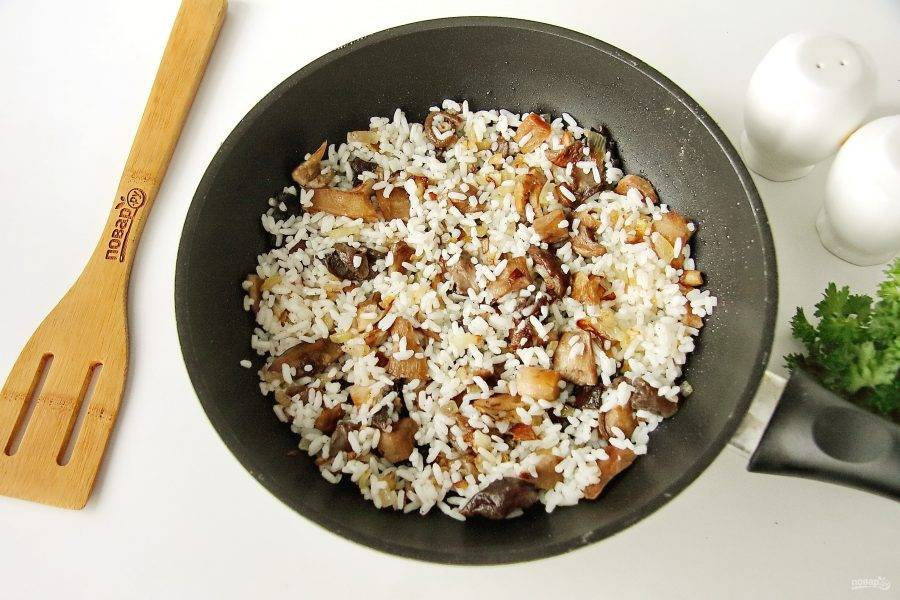 Добавьте отваренный рис, перемешайте, прогрейте пару минут, после чего снимите с огня и дайте содержимому немного остыть.